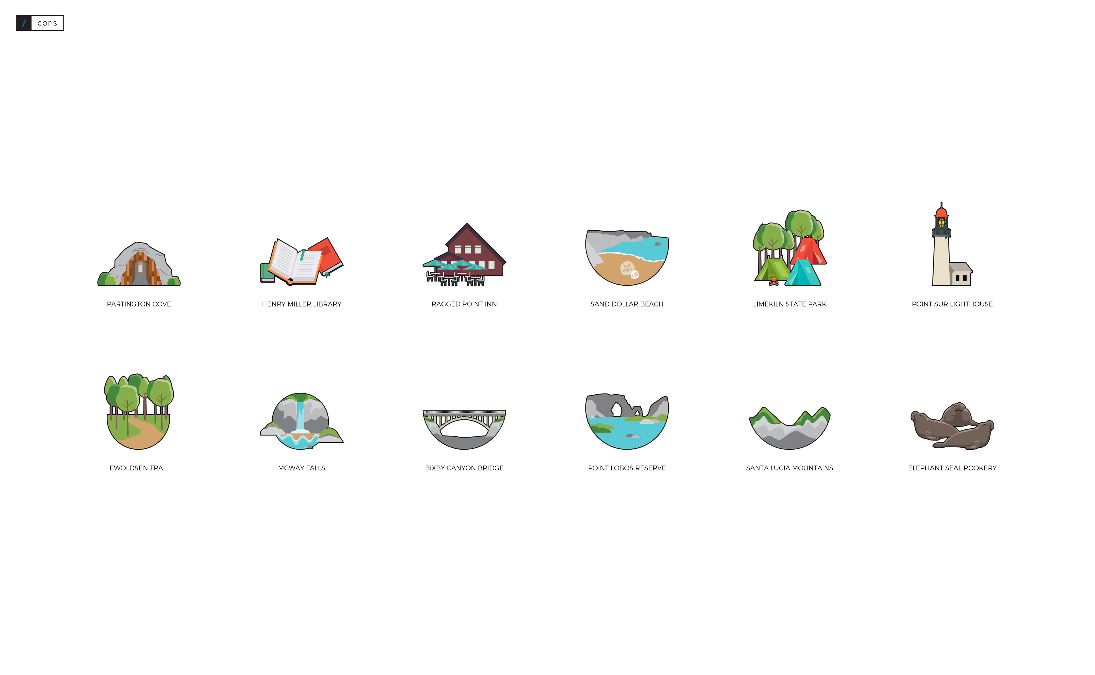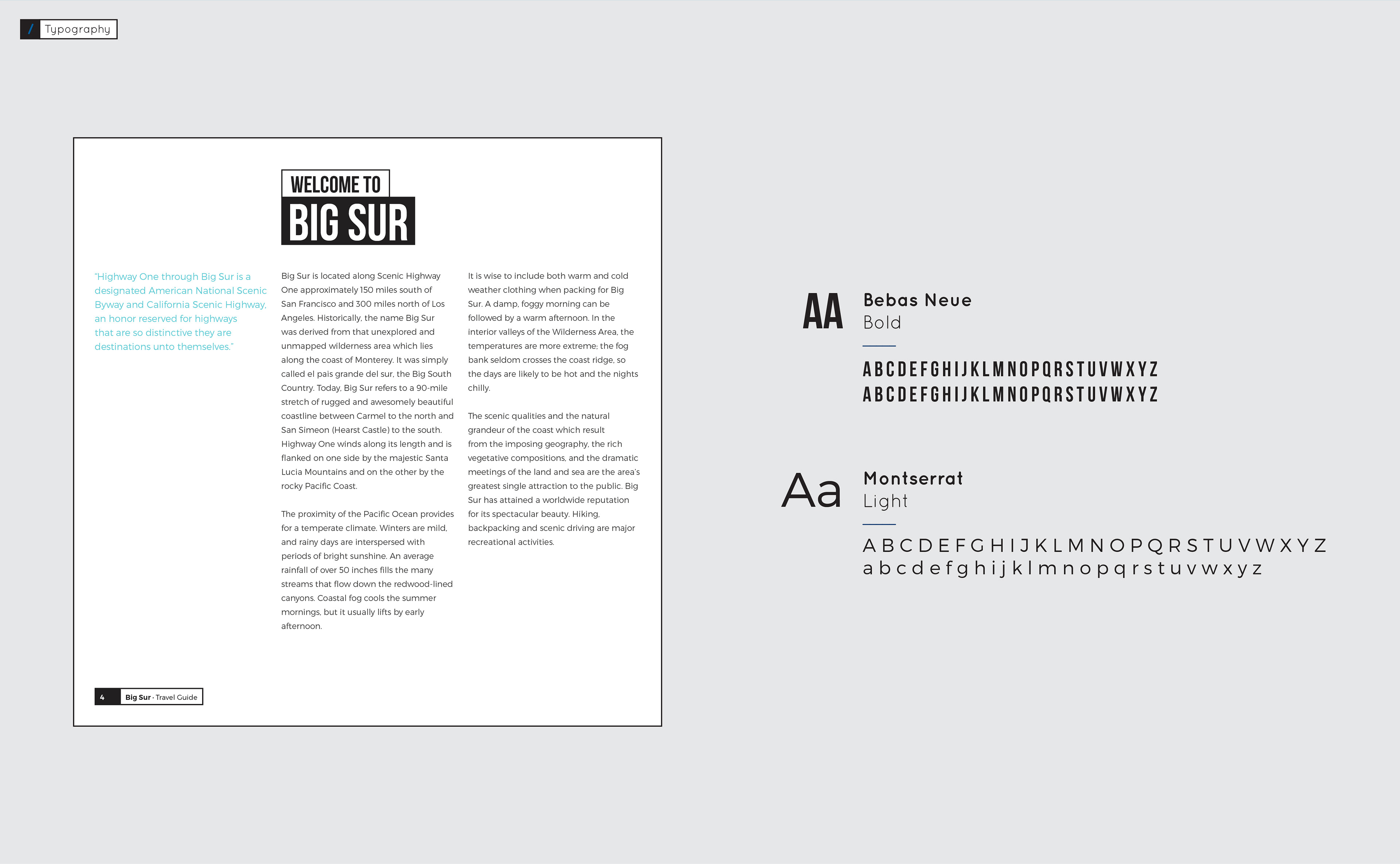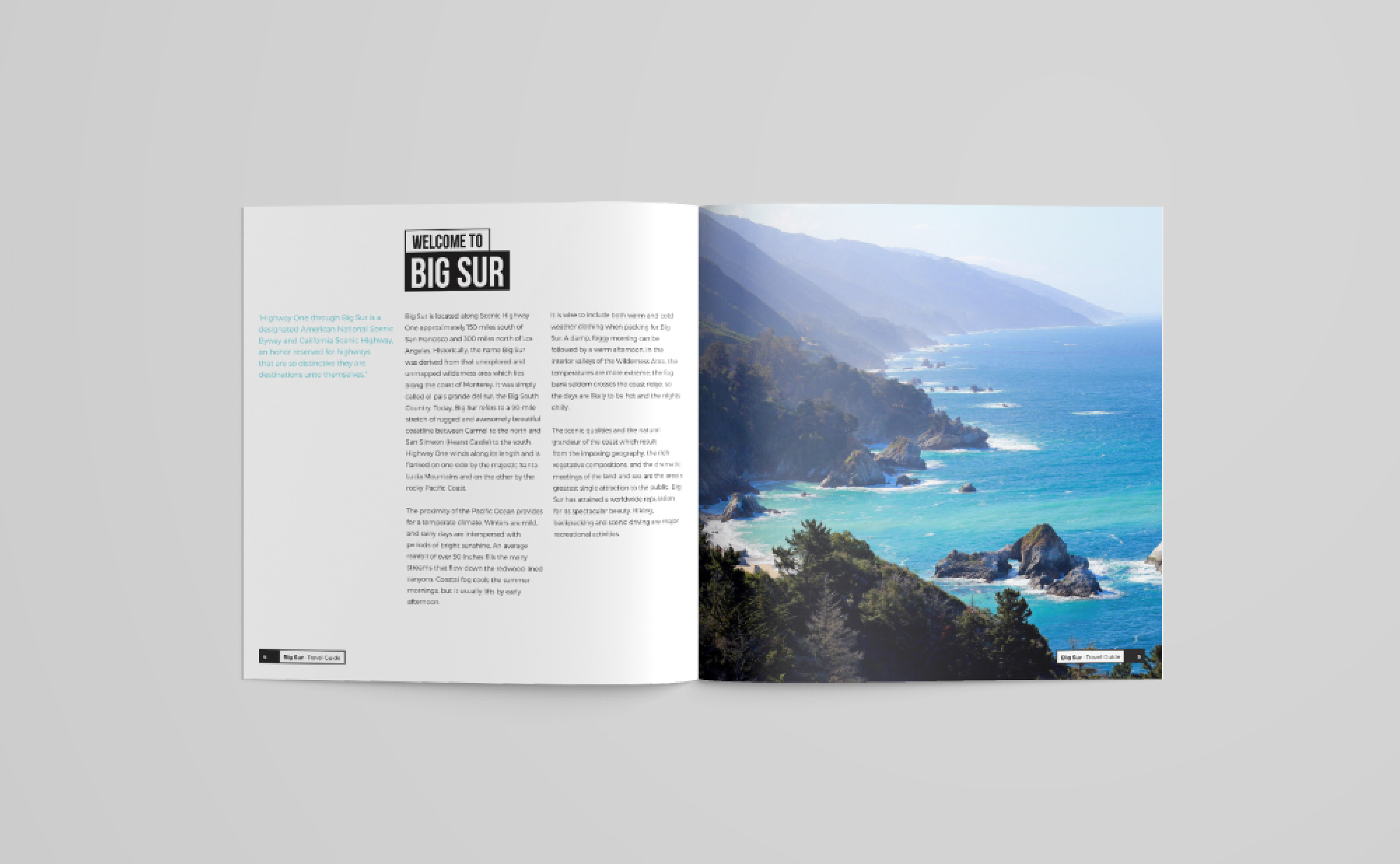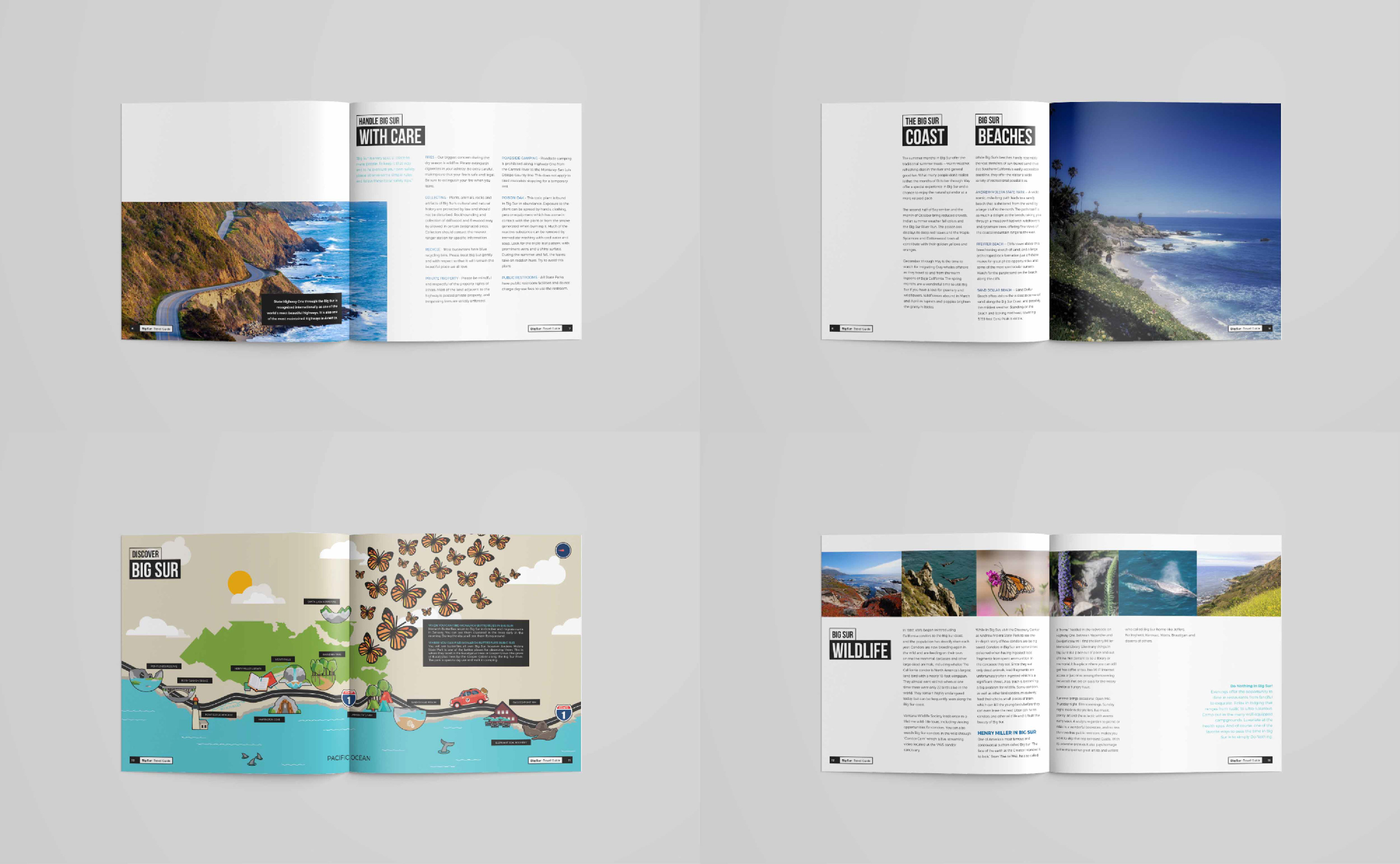 This project was a conceptual rebranding for Big Sur, California that includes logo design, illustrated map, posters, and travel guide layout.